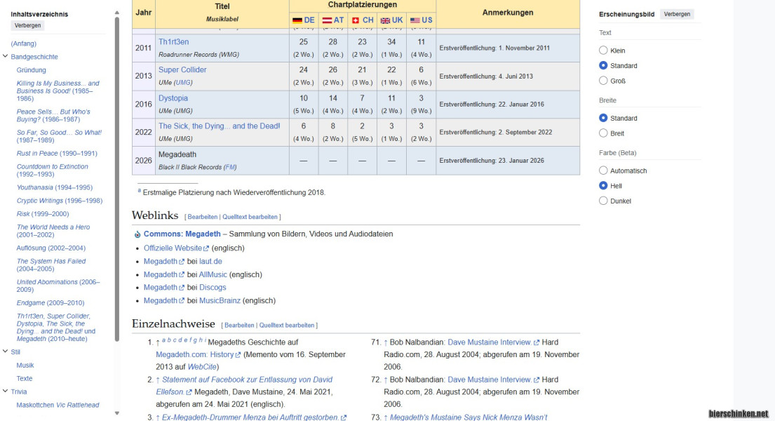 Die haben seit Ewigkeiten ne Strafe im Vertrag, wenn Veranstalter Megadeth falsch schreiben, also Megadeath, dann kostet es 500 Doller Strafe. Schätze wenn Dave spritz kriegt, datt Wikipedia sich da einen Scherz erlaubt, hagelt es Klagen.
