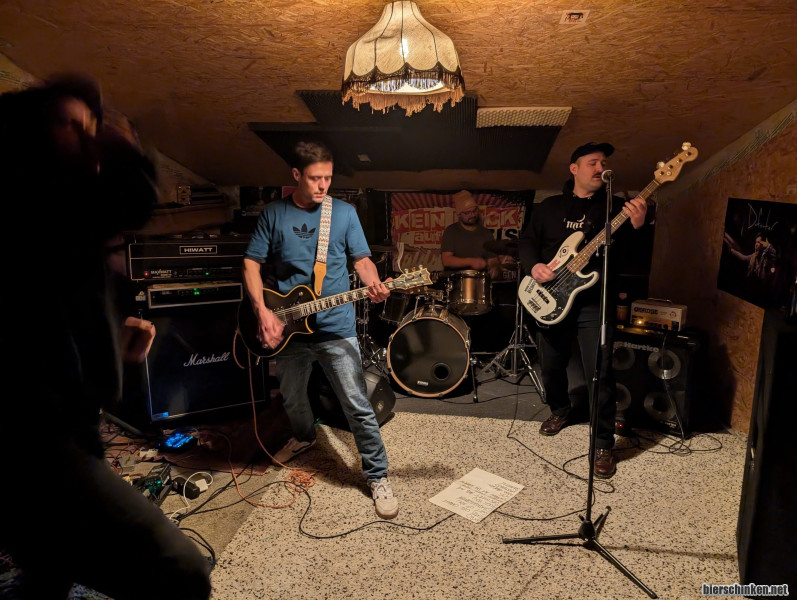 Hier also ein weiteres Bild für ACT THE FOOLs Sammlung. Marathonmann Fischi ist selbstverständlich unscharf, aber das musikalische Bollwerk dahinter ist ganz gut erwischt. Damit habe ich im 5. Bericht über die Band womöglich einen treffenden Begriff für ihren Sound gefunden, der sich in Einklang mit den Inhalten grundsätzlich auf der schwermütigen Seite bewegt und die BPMs gerne auch zurückfährt. Umso fetter wirkt der Geschwindigkeitsboost, wenn Missstand losbricht oder es in die erste Strophe von Haben oder Sein geht. Bei dieser ersten Show nach dem Jahreswechsel müssen ATF allerdings feststellen, dass manches wieder geprobt werden möchte. Um sie zuhause in Bestform hören zu können, nehme ich eine Soli-Platte von Nebel mit, deren Einnahmen an UNICEF "Kinder im Krieg" gespendet werden. Totale Ehrenaktion der Band! Übrigens arbeiten Act The Fool aktiv an einem neuen Release, der in nicht allzu ferner Zukunft erscheinen soll.
