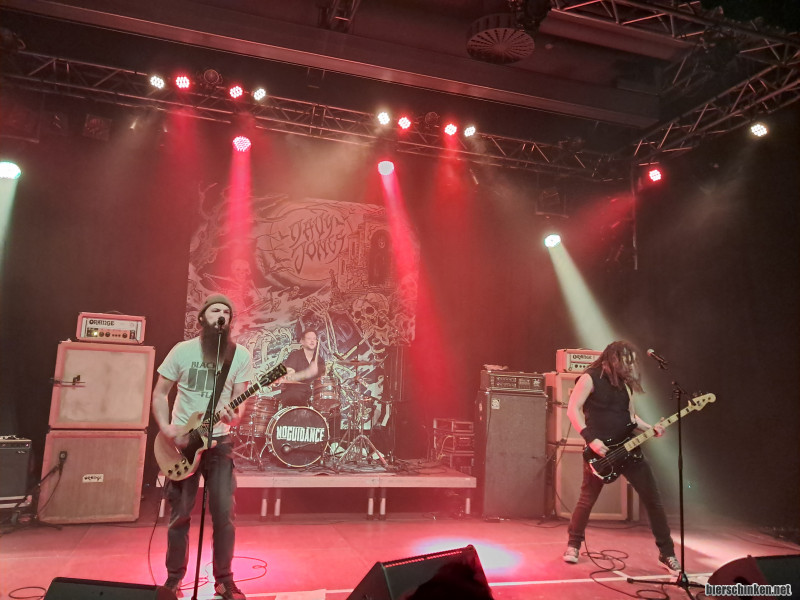 DAVY JONES machen den Beginn. Die Band prügelt im besten Sinne ihr Set durch, das Publikum ist allerdings noch etwas hüftsteif. Vermutlich müssen sich alle noch dran gewöhnen, das hier im Kulturhaus des Kreises Siegen-Wittgenstein rotziger Punkrock gespielt wird.