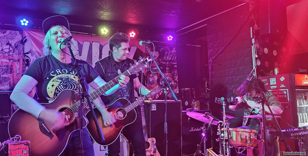 Roland der Voland: Die erste der Bands, die ich nicht kenne, sind WICK BAMBIX. Bzw. habe ich zwar Wick Bambix schonmal gesehen, aber nicht als WICK BAMBIX und sowieso hat sie heute auch noch zwei Mitmusiker mitgebracht. Das gibt der akustischen Mukke etwas mehr Tiefe. Das ist durchaus schöne Musik, zu der mensch etwas mitwippen kann. Aber obwohl auch ein paar Mal die E-Gitarre hervorgeholt wird, freue ich mich dennoch darauf, dass es bei den nächsten Bands lauter wird. Also vermute ich, kenne ja nichts!