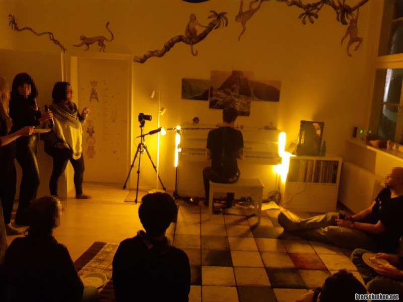 Dass der Künstler mit dem Rücken zu uns sitzt, ist schon irgendwie ungewohnt, aber passt natürlich zum Flügelsetting. Zwischen den Songs neigt er sich immer zu uns - sehr gelenkig, denke ich so bei mir. Es gibt ein paar kleine Stories und Backgrounds zu den Songs, gespielt wird (glaube ich) die komplette Platte.