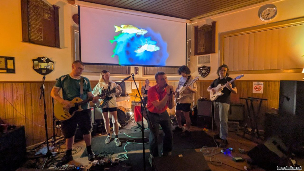 Walter: 21.02. BDK Record Fest im Anglerclub in Preston. Super witzige Location, überall hängen Angler-Trophäen und auf die Leinwand werden regelmäßig Fische projiziert. Einmal spielte der Licht und Ton-Mensch auch live einen Angel-Simulator. Dazu gab es 9 sehr verschiedene Bands für 20$ also etwa 12€. Gespielt haben Jack Spencer, DVD, Special Guest, The Carp Factory, Equestrian Fields, De Porsal, Bughunt (Foto), Billiam (ohne Band) und The Myki Cops. Letztere entpuppten sich als Met Dog, die sich als Fahrkarten-Kontrolleure tarnten. Myki ist übrigens die Melbourne ÖPNV Bezahlkarte. Met Dog kennen eventuell einige vom Sonic Waves! Stabiles Programm