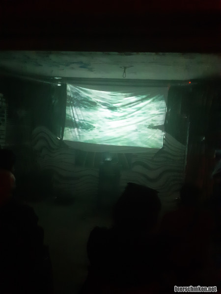 APPLEZ91 kommt aus Italien, spielt auch noch in diversen bekannten und unbekannten "richtigen" Bands und lebt hier sein Faible für, äh, Wasser aus. "Watercore" nennt sich das wohl, und alle Geräusche sollen irgendwie durch Wasser erzeugt worden sein. Was jetzt nicht heißt dass alles plätschert und alle erstmal aufs Klo rennen müssen - die Geräusche sind natürlich dermaßen durch den Noise-Filter gejagt, dass am Ende doch wieder nur kratziges Gewummer bei rum kommt. Der Künstler versteckt sich hinterm FOH und vertieft sich dort ins Knöppe drehen, während die Aufmerksamkeit des Publikums auf die Leinwand gerichtet ist, wo auch visuell stark verzerrtes Wasser zu sehen ist. Vom schützenden Lebenselixier bis zur zerstörerischen Naturgewalt wird hier die komplette Bandbreite des Wassers abgedeckt. Zwischendurch gab es eine Pause mit Werbung für Wasser. Dass an der Stelle Leute (inklusive mir) gelacht haben, hat meinen kompletten Glauben in Noise gleichzeitig zerstört und erneuert. Alles verrückt hier.