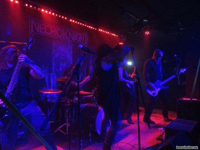 Erste Band: NECROKNIGHT. Schon irgendwie alles geil an dieser Band. Die sind natürlich metal-mäßig geschminkt im Gesicht, keine süße KISS-Katzen-Optik sondern so gefährliche schwarze Streifen wie einmal Grillkohle über die Fresse gezogen. Dann kommt der Sänger natürlich mit nem Schwert in der Hand auf die Bühne. Ehrensache! Und schon der Name ist so Klischee: Wie viele Metal-Bands mit "Knight" im Namen mag es wohl geben? Und wie viele mit "Necro"? Gibt es mehr Horrorpunk-Necro-Bands oder mehr Metal-Necro-Bands?