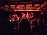 Die Blackmetalbands dürfen beide Tage die Shows eröffnen. So ist man pünktlich bei HIERON im weihrauchgetränkten Raum, wo ein etwa 10-minütiges Intro, das nach Knochenmühle klang, die Leute gut warten ließ. Anschließend folgt dieser brachiale Blackmetal, wo in der Regel weitgehend durchgeprügelt wird. Das ist schonmal ein ganz entzückender Beginn.
