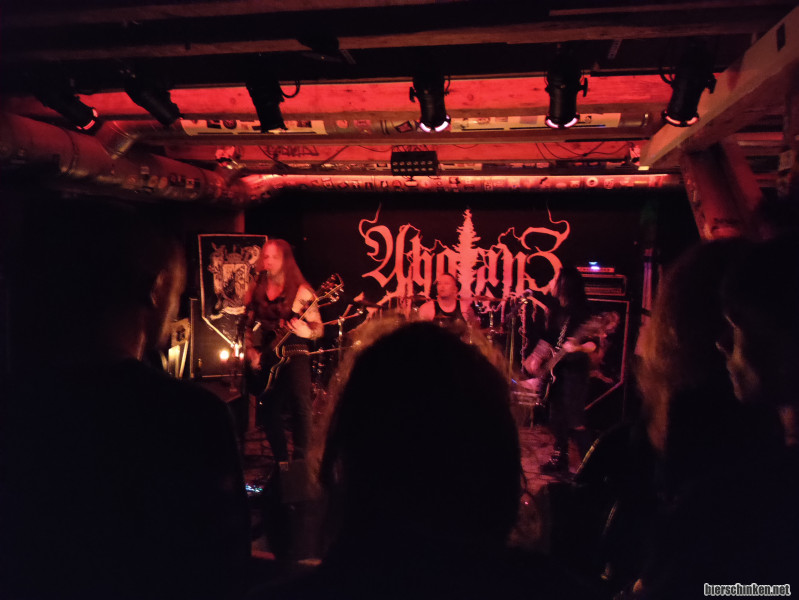 Tag 2. Das Personal im Auto wechselt durch und wir kommen leicht verspätet zu ULTIMA NECAT. Am 01.11.2024 hier schon gesehen. Wie lange ich gesucht habe, ohne eine Suchmaschine anzuwerfen. Ich dachte nicht, dass das schon wieder so lange her war. Geboten wird wie gestern Weihrauch und ein großer warum-auch-immer kerzenbedingter Halbkreis. Der Blackmetal alter Schule fetzt derweil. Dann die dritte und letzte Blackmetalcombo im Lineup mit ABGLANZ (im Bild) aus Goslar, wo ich beim Kreuzhören im Vorfeld einfach mal die komplette letzte Platte durchgehört habe. Live ist das Ganze etwas härter, da weniger ruhige Parts vorkommen. Trotzdem coole Atmo mit feinem halligen Gesang. Die Ansagen verhallten allerdings auch komplett. Der Kerzenhalbkreis blieb derweil bestehen.