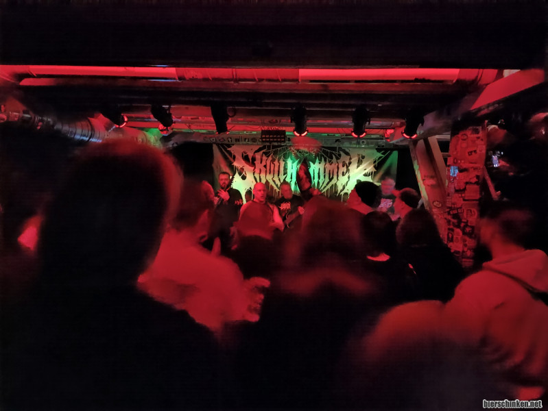 Den Abschluss machen dann SKULLHAMMER, wobei ich im Nachinein schonmal vor zig Jahren (2009) eine Art Vorgänger mit End Of Days in Niesky bei einer Waschküchenshow gesehen haben muss. Habe extra nochmal bei Partyausfall recherchiert. Bei Skullhammer dachte ich die ersten ein, zwei Songs - was das denn für eine "Karikatur an Band" sei. Ich hatte so South Park Vibes wenn die Metal durch den Kakao ziehen wollten. Aber als ich dann mich an die Schlagzahl der Bassdrum gewöhnt hatte, die mal an einem Presslufthammer, mal an einem alten getunten Trecker erinnerte, wurde ich doch gut warm mit der Combo. Knapp 30 Minuten schafft man inklusive Sepultura-Cover und weil die Leute noch so gut Bock hatten, spielte man einen nochmal doppelt. Guter Abschluss bei leicht wechselndem Publikum an beiden Tagen. Heut waren jedenfalls weniger Basecaps am Start. Publikum ansonsten genial durchmischt von jung bis alt, paar polnische Gespräche waren auch zu hören und alles ohne jeglichen Stress. Gut besucht war auch. Alles bestens.