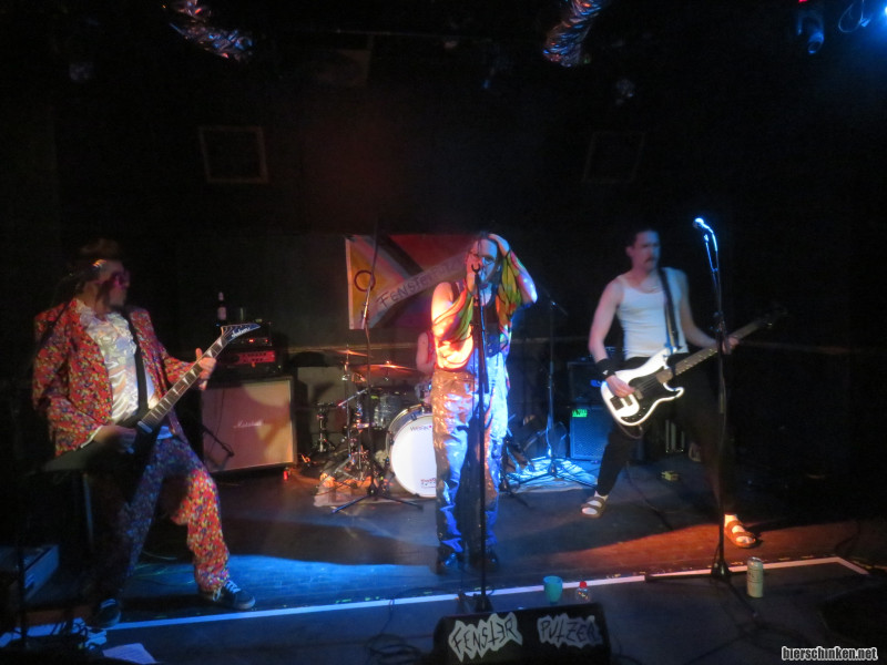 Fö: So, nu aber zur ersten Band! FENSTERPUTZER kommen aus ebendiesem Witten, und das lassen sie uns in jedem zweiten Song wissen. Wischt man diese Lokalromantik mal beiseite, ist der Auftritt aber durchaus unterhaltsam. Könnte weitestgehend unter Funpunk laufen, musikalisch durchaus abwechslungsreich, aber eben Punk.