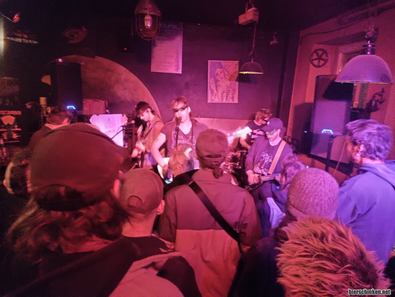 Inzwischen bin ich im Mondfisch eingetroffen, wo es mich auch noch nicht hingeführt hat. Würde das als Bierbar charakterisieren mit sehr fairen Preisen. Halber Liter um die 3€. Für jeden Biergeschmack sollte was dabei sein. Derweil lasse ich mir erklären, wo die Kleiderhaken zu finden sind und dann geht´s auch recht fix los mit THE GOBS aus Olympia, Nordwest-USA.