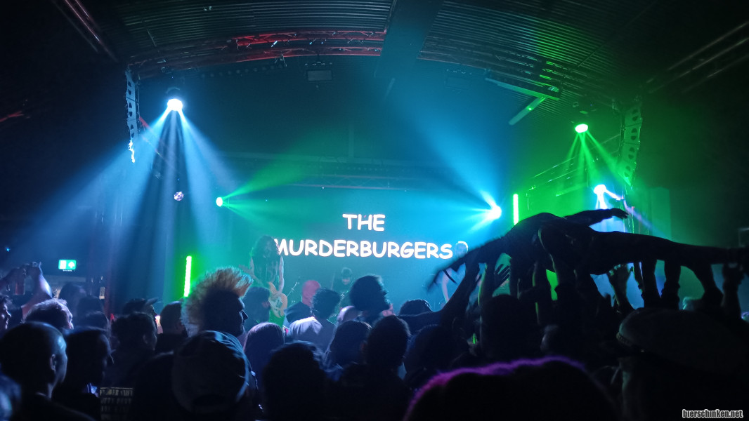 Für ein paar Top-Acts sind wir aber doch noch rechtzeitig zur Tea Time in die City gedüst: Die MURDERBURGERS hatte ich letzten Monat schonmal gesehen. Selbe Setlist, selber Spaß. Nur dass Fraser & Co. noch schneller und hektischer spielen, aufgrund der streng begrenzten Spielzeit. Und dass sie den besten digitalen Backdrop des Festivals haben. Nächstes Mal soll die Schriftart Wingdings genutzt werden.