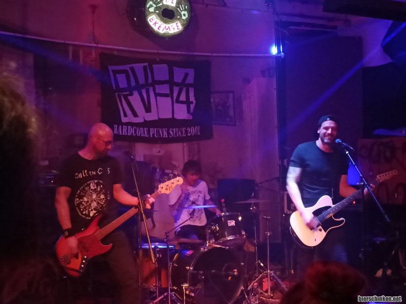 RV-4 machten den Anfang. Das lief genau so wie ich es mag. Tempo, Tempo, Tempo. Andere würden fehlende Abwechslung bemängeln oder sich etwas Midtempo zwischendurch zum Verschnaufen wünschen, aber ich fand's einfach nur geil. Da wird bei jedem Song Vollgas gegeben, der Schlagzeuger knüppelt im Mordstempo ohne Pause und Sänger und Bassist spielen sich gegenseitig zu. Das macht einfach nur Spaß. Auch den dreien scheint der Auftritt voll Bock zu machen. Zwischendurch kommt immer mal der Blank Out Sänger und springt kurz mit rein. Die Bandfreundschaft ist hier deutlich sichtbar.