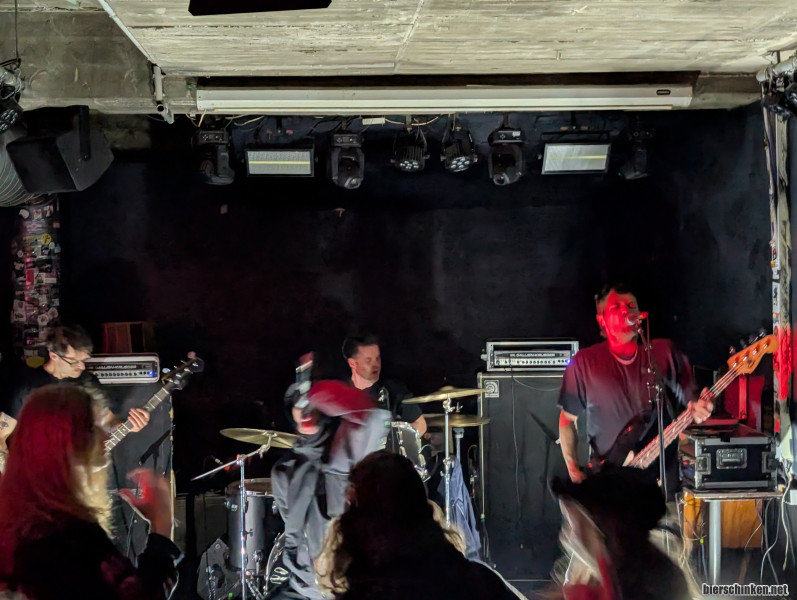 Letzte Band WORLD PEACE. Hab nur ein Foto weil mich die Kürze des Sets (8 Minuten!!!) überraschen. Entweder sie Jungs müssen dringend einen Zug erwischen oder das ist Konzept. Sehr professionell durchgeballerter schneller Extreme Metal mit zwei Bassisten und ohne Gitarre. Also insofern alle Bands des Abends mit unterschiedlichen Bandideen. Die Jungs sind wirklich tight und legen volle Energie in das kurze Set. Dazu noch kleine Strobo Lichtshow. Durch die zwei Bässe wird Wert auf einen knackigen und reinrömernden Sound gelegt der gut rüberkommt. Sänger flippt natürlich aus wie es sich gehört. Schönes Konzert, danach noch Discobetrieb bist um 4. Das Konzept von erst Konzert und dann Disco ist cool. Kann man machen!