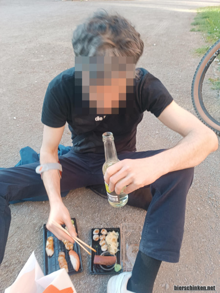 Horace: Kurze Stärkung vor der ersten Band. Standortgerecht (wir sind schließlich im hippen Westen) gibt's Sushi und Weinschorle - Oi!