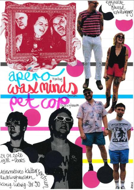 Im Alternativen Kulturzentrum Recklinghausen e.V. startet am Samstag, den 24. Januar, endlich das neue Konzertjahr! Wax Minds kommen aus Bremen angereist. Im Gepäck haben die stets fantastisch gekleideten vier aus Bremen garagigen Lo-Fi-Punk, der zum Tanzen und Staunen einlädt! Weil sowohl im Van als auch im Programm noch Platz ist, bringen sie Hobbi der Band Empty Bones gleich mit – er spielt ein Solo-Set, das so wohl auch in der Garage erdacht wurde! Pet Cop aus Recklinghausen komplettieren den Abend mit ihrem merkwürdigen Egg-Punk, den sie auf Kassette inzwischen auch bei Musik-Labels Australien und den USA unter die Leute bringen konnten.