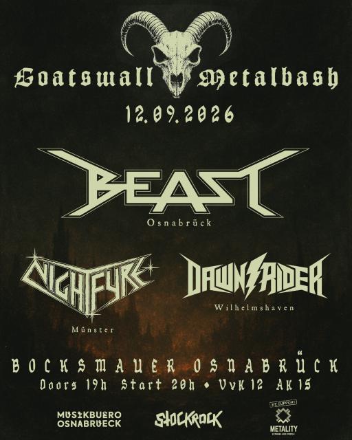 „Heavy Metal is the law!“ Unter diesem Motto findet am Samstag, den 12. September 2026 erstmals der GOATSWALL METALBASH im Saal Bocksmauer vom Osnabrücker Haus der Jugend statt. Mit DAWN RIDER aus Wilhelmshaven, NIGHTFYRE aus Münster und BEAST aus den heimischen Gefilden konnten drei fantastische Vertreter der New Wave of Traditional Metal verpflichtet werden, um euch ordentlich einzuheizen und mit magischen Metal-Hymnen zu verzaubern. Unterstützt wird die Veranstaltung vom Musikbüro Osnabrück, dem Stockrock e.V. und dem Osnabrücker Chapter von Metality. Also, streift die Kutte über und kommt vorbei! 🤘