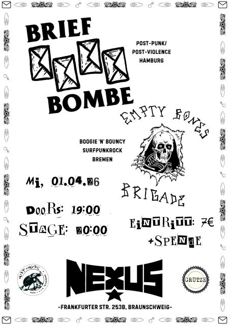 BRIEFBOMBE ist eine (mail-fronted) Postpunkband aus Hamburg. Ihre 20 Sekunden bis 1 Minute langen Hardcorepunk / Fastcore Songs behandeln Post- und Paketdienstleistungsthemen. Solidarische Grüße gehen raus an alle streikenden Kolleg*innen bei DHL, Amazon und Konsorten. Streik, Sabotage, langfristig Enteignung!