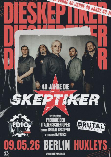 Das Unbehagen des Individuums in der Gesellschaft, seine Skepsis und sein Zweifel brechen sich seit vier Jahrzehnten sehr amtlich unter dem Namen DIE SKEPTIKER ausdrucksvoll Bahn – auf Tonträgern, bei Live-Konzerten und in den Herzen ihrer Fans, die inzwischen auf mindestens zwei (textsichere) Generationen kommen. Ja, ja, ja: DIE SKEPTIKER werden 40! Dazu spielen sie eine ausgelassene Jubiläumstour. DIE SKEPTIKER, 1986 in Ost-Berlin gegründet, spielten und spielen energetischen, elektrisierenden und euphorisierenden Punkrock mit klugen deutschen Texten. Konstante und einzig verbliebener Skeptiker der Gründungsformation ist der Sänger und Texter EUGEN BALANSKAT. Über Mitgliederwechsel und eine Bandpause (2000-2006), Alben und Touren, Fährnisse des Lebens und gesellschaftlichen Wandel hinweg ist eines sicher: Die Band und ihr Sänger haben von ihrer emotionalen Wucht bis heute nichts verloren! Wir reden über Haltung. Eine Haltung, die konsequent und offen, ernsthaft und überzeugend seit vier Dekaden von DIE SKEPTIKER ausgeht: mit Unerschrockenheit, Mut und Wut, die Gesellschaft zersetzend vorwärtszutreiben. Hart und schnell im Rhythmus, ernst und politisch im Auftreten, lyrisch und intelligent im Text – bis heute Punkrock mit Stil und der unvergleichlichen Stimme unseres charismatischen Caruso-Punks Eugen. DIE SKEPTIKER, mit Frontmann Eugen Balanskat, Dominik Glöckner und Matthias Stephan an den Gitarren, Jacob Thauer am Bass und Wieland Wehr am Schlagzeug, sind immer noch eine „andere Band“, eine unverbrauchte, zeitlose wie zeitgenössische Gruppe mit historischem und kritischem Bewusstsein und eigenem Blick auf die „Zukunft“. Für die Geschichtsschreibung: Die Rede von den „Dead Kennedys des Ostens“ hat einen Schönheitsfehler – DIE SKEPTIKER könnten nie-niemals ihren Sänger austauschen! Die Tour zum 40-jährigen Bandjubiläum feiert die alten wie neuen Lieder von den ersten Aufnahmen bis zum letzten Album ab. Es gilt: Kein Weg zu weit! Denn Harte Zeiten gab und gibt es stets, Sauerei sowieso, Dada in Berlin – da, dort in Berlin! Unterwegs sind Schwarze und Stahlvogelkrieger, Frühe Werke werden zum Besten gegeben, schließlich geht es um Fressen und Moral, da heißt es: Wehr Dich und nicht ganz unbegründet lautet das Fazit: Aufsteh’n! Die Klassiker der frühen Tage sind frisch und gültig, die neuen Werke knüpfen nahtlos daran an. Wir hören Eugen mit kraftvollem jugendlichem Zorn. Wir fühlen und wissen: Es braucht diese Band. Es braucht DIE SKEPTIKER.