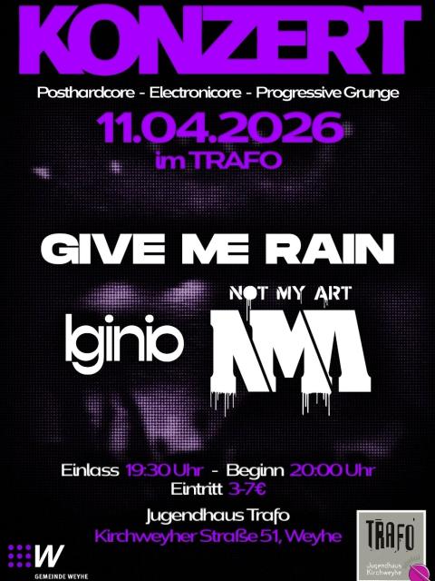 Am Samstag, den 11.04.2026 gibts im TRAFO geballte Ladung Post-Hardcore, Electronicore & Progressiv Grunge auf der Bühne. Das ganze mit @givemerain.official @iginioband und @notmyartrocks