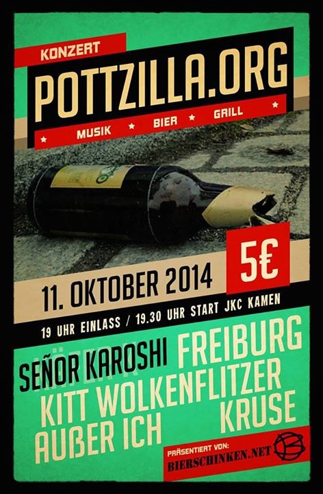 Geile Bands, kaltes Bier und leckeres vom Grill. Das alles und noch viel mehr am 11.10.2014 im Jkc Stadt Kamen beim POTTZILLA Konzert. Einlass 19 Uhr und gestartet wird gegen 19.30 Uhr. Das LineUp bietet für jeden Besucher genau das Richtige: