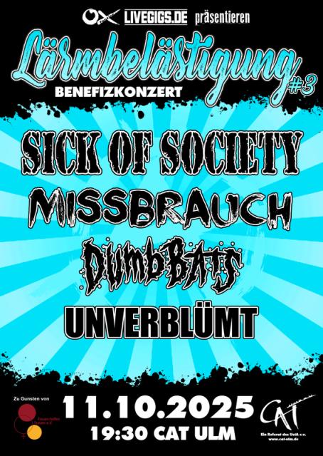 Punkrock für den guten Zweck! Am 11. Oktober 2025 heizen Sick of Society, Missbrauch, Dumb Bats und Unverblümt im CAT Ulm ordentlich ein. Der Eintritt des Benefizkonzerts geht an den Frauen helfen Frauen e.V. – Sei dabei und rocke mit für mehr Solidarität.