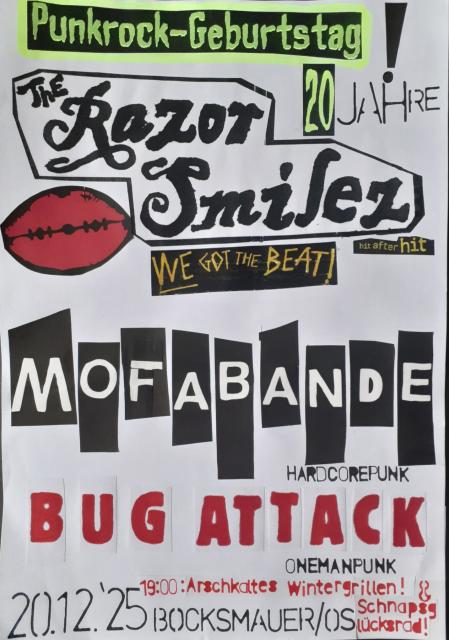 Kinder, wie die Zeit vergeht! Seit 20 Jahren treiben die Razor Smilez nun schon ihr Unwesen in der Gegend und sind in der Zeit auch gehörig rumgekommen. Auf der Habenseite neben einem Haufen Gigs in den Punkrock-Kaschemmen dieser Welt erblickten auch drei Langspieler das Licht der Welt, außerdemdem zum Beispiel eine Split mit The Damned und Neuaufnahmen und eine Neuaufnahme des Hansa-A-Plast-Hits Rock'n'Roll Freitag mit Anette Benjamin (Hans-A-Plast, Die Benjamins). Seit Neuerdings (also so 3 Jahren) spielt Musikbüro-Marco da die Schrammelgitarre - es heißt, zum Zeitpunkt des Einstiegs in die Band habe er nicht einmal eine besessen. Ganz neu im Line Up dabei nun Julla (Ex-Svenson), ebenfalls an der Schrammelgitarre. Mehr ist mehr!