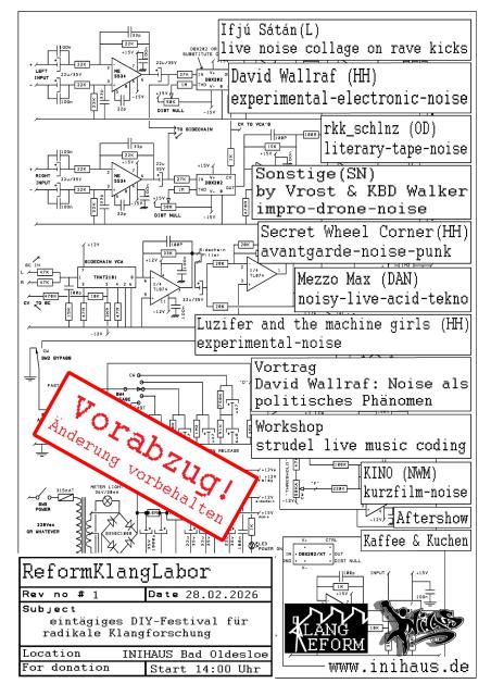 "Das ReformKlangLabor ist ein eintägiges Experimental- und DIY-Festival, das wissenschaftliche Auseinandersetzung mit Klang, subkulturelle Praxis und Clubkultur miteinander verbindet. Es versteht sich als offener Raum für experimentelle Kulturproduktion, kritischen Austausch und gemeinsames Erproben.