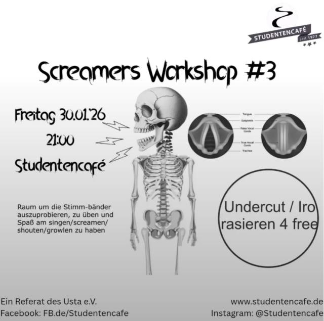 Du hast Bock zu singen, schreien, shouten oder growlen - weißt aber nicht genau wie? Dann komm vorbei und probier dich aus! Wir schaffen einen Raum, um die Stimmbänder auszutesten, zu üben und einfach Spaß zu haben.