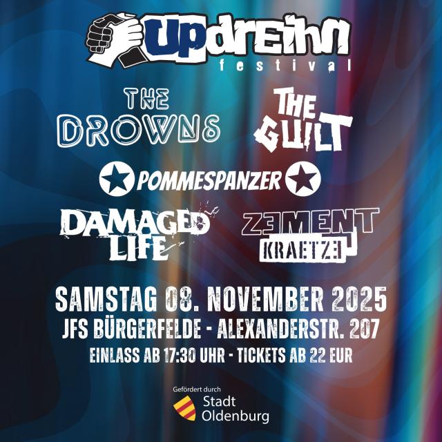 Das Updreihn kehrt heim zu alten Gefilden: Zurück "an de Utfahrt" startet die 6. Auflage des beliebten Indoorfestivals am 8.11.25 wieder in der ursprünglichen Location, der Jugendfreizeitstätte Bürgerfelde. Sichert euch jetzt Tickets und lasst euch diese bunte Mischung aus Punk, Ska und Rock'n'Roll nicht entgehen!
